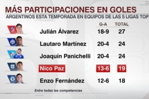 五大联赛阿根廷球员参与进球榜:小蜘蛛27球最多,帕斯19球第四