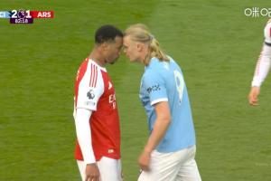 体育资讯04月20日讯 曼城vs阿森纳第83分钟,哈兰德、加布里埃尔顶牛两队爆发冲突,两人各吃一黄!