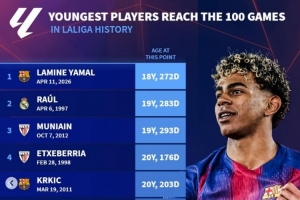 西甲最年轻百场榜:亚马尔压劳尔居首,加维、哈马、阿圭罗在列